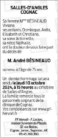 Cet espace « condoléances » est dédié à la mémoire de Monsieur André BÉSINEAUD.