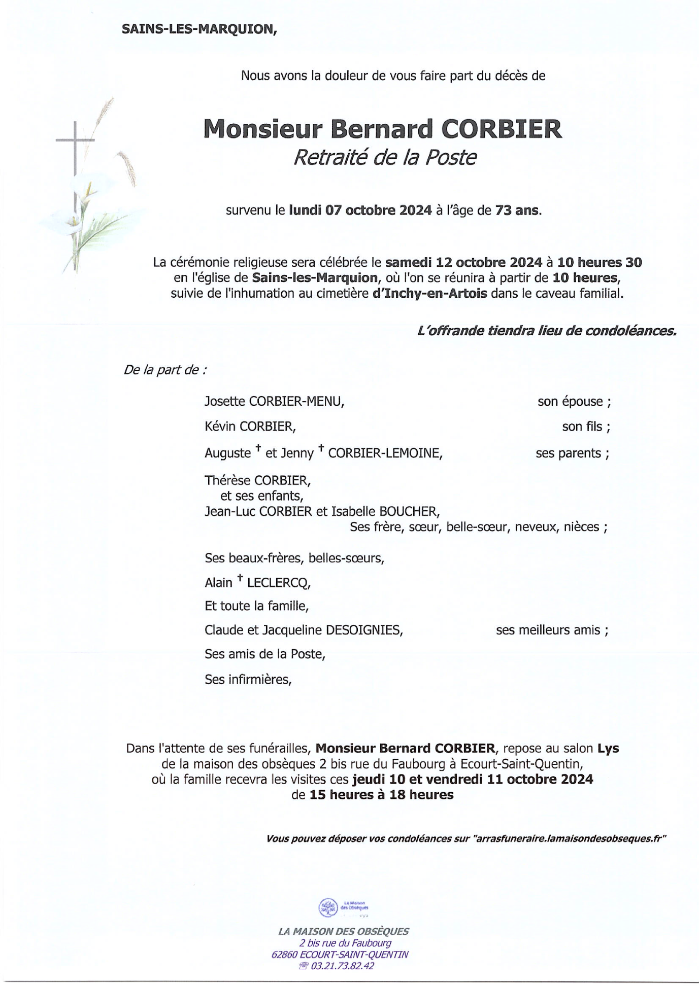Cet espace « condoléances » est dédié à la mémoire de Monsieur Bernard CORBIER.