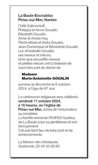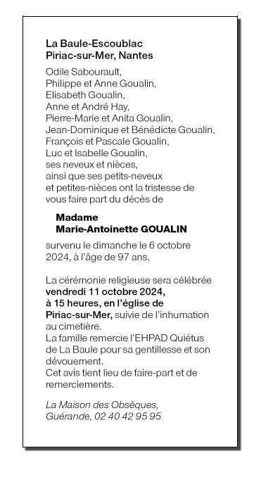 Cet espace « condoléances » est dédié à la mémoire de Madame Marie-Antoinette GOUALIN.