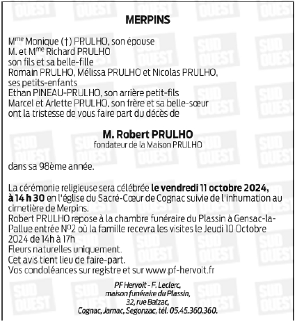 Cet espace « condoléances » est dédié à la mémoire de Monsieur Robert PRULHO.