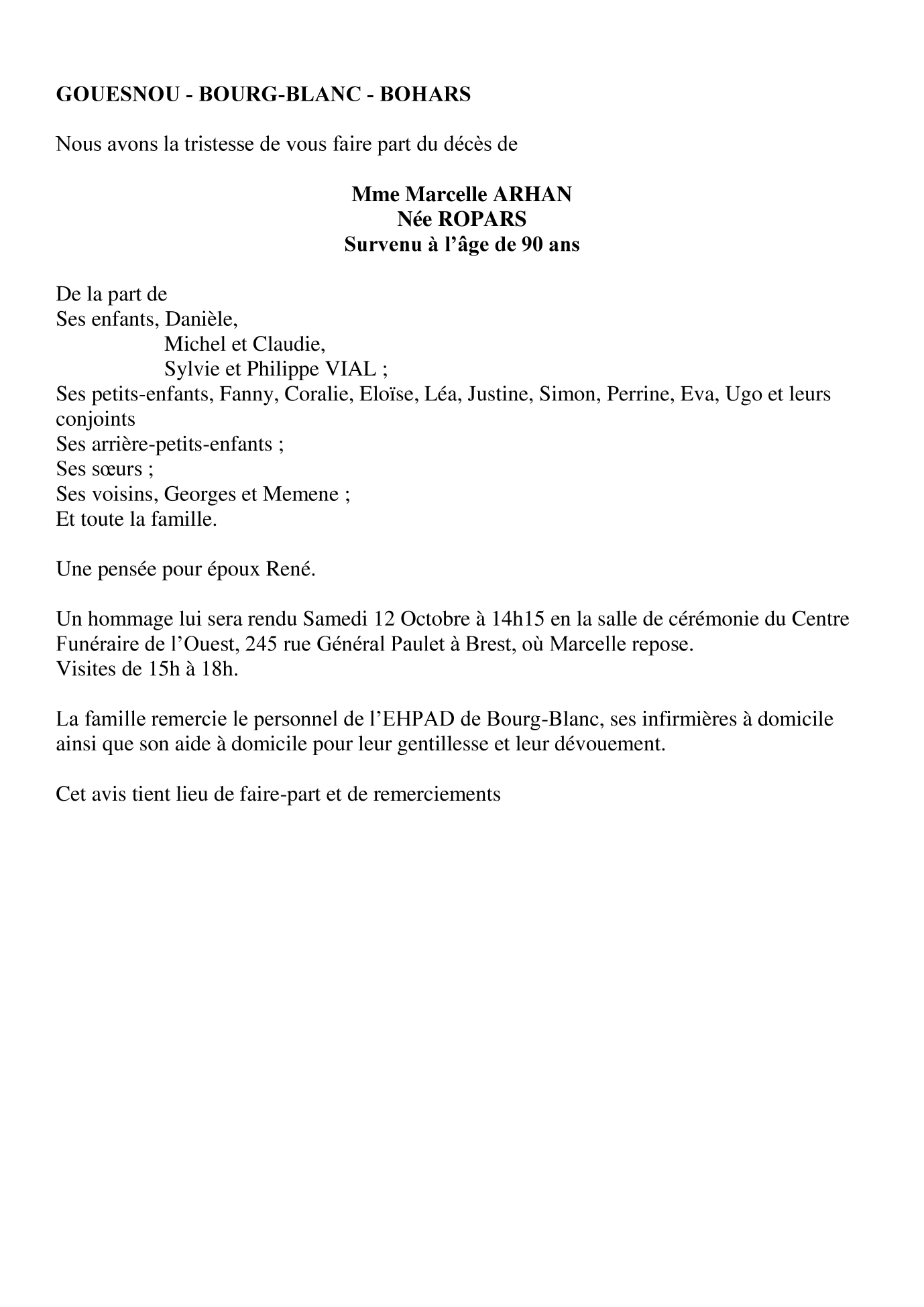 Cet espace « condoléances » est dédié à la mémoire de Madame Marcelle ARHAN née ROPARS.
