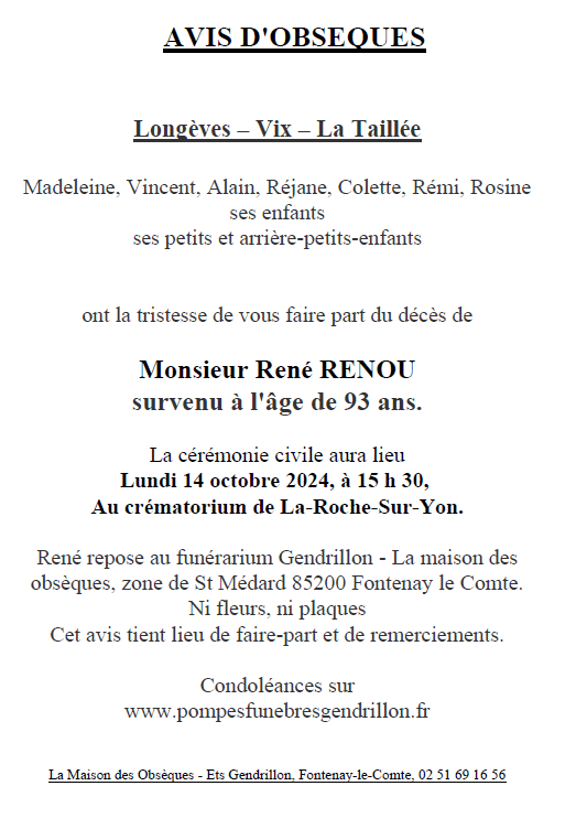 Cet espace « condoléances » est dédié à la mémoire de Monsieur René RENOU.