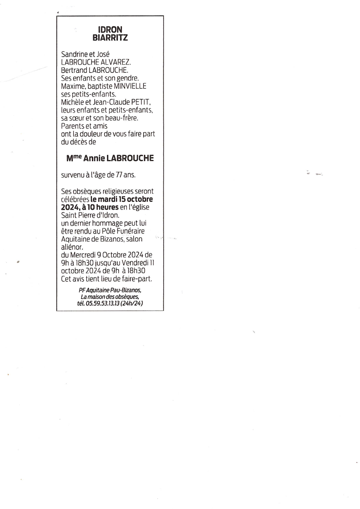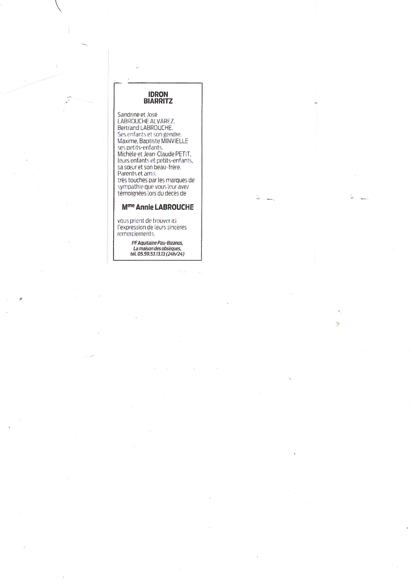 Cet espace « condoléances » est dédié à la mémoire de Madame Annie LABROUCHE née COMA.
