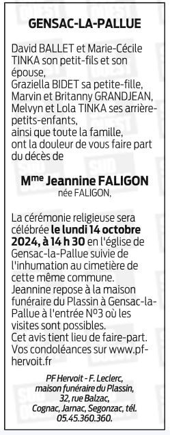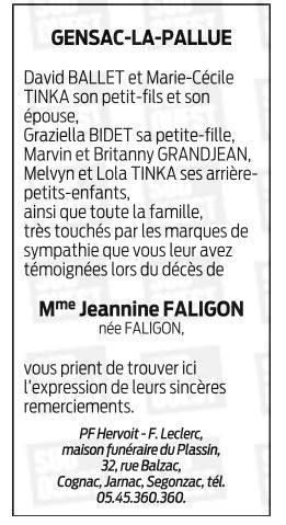 Cet espace « condoléances » est dédié à la mémoire de Madame Jeannine FALIGON.