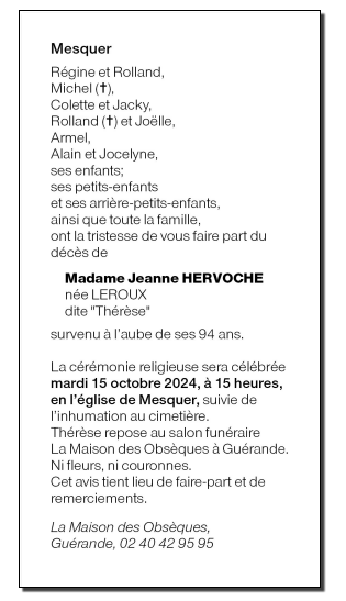 Cet espace « condoléances » est dédié à la mémoire de Madame Jeanne HERVOCHE née LEROUX.