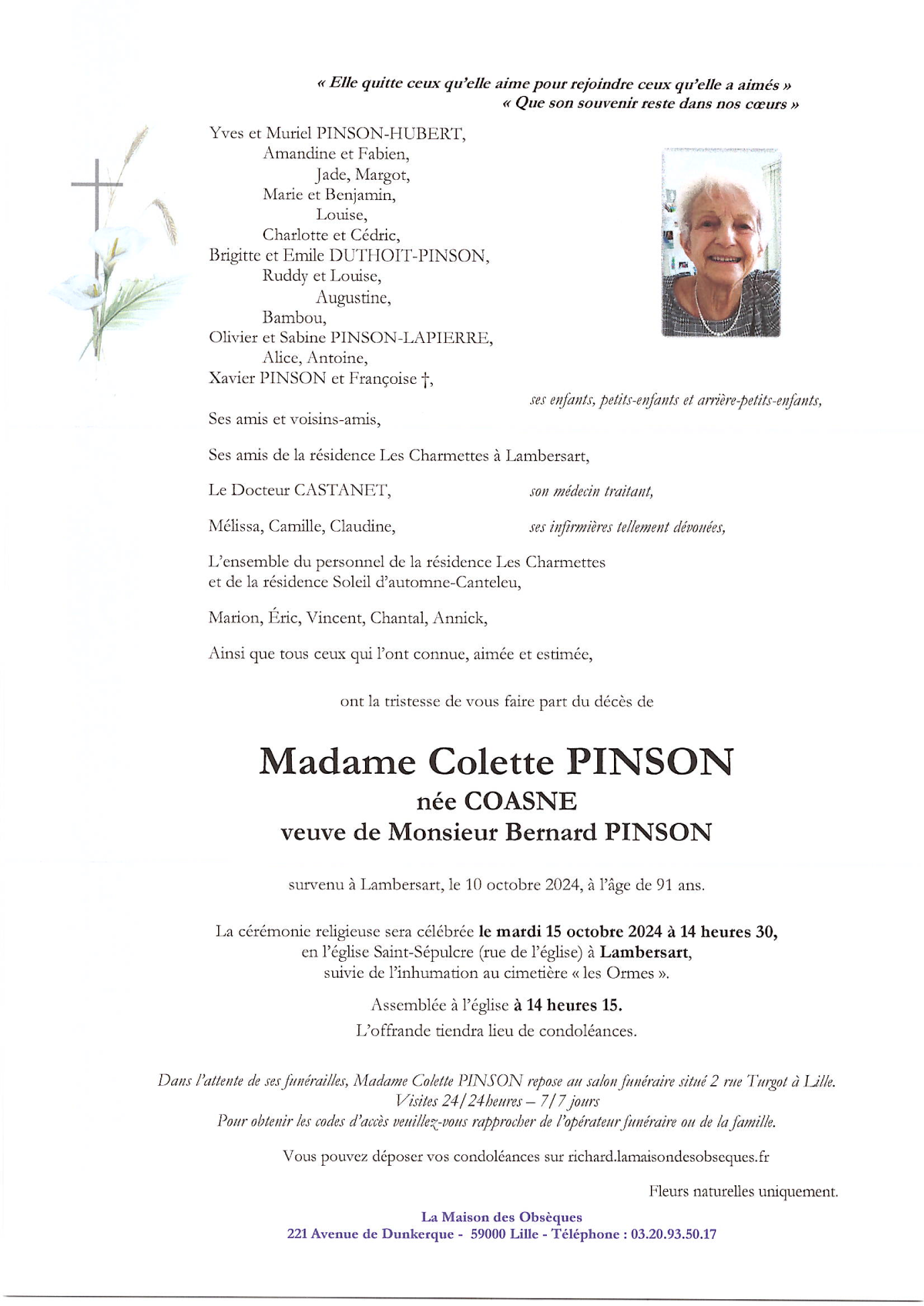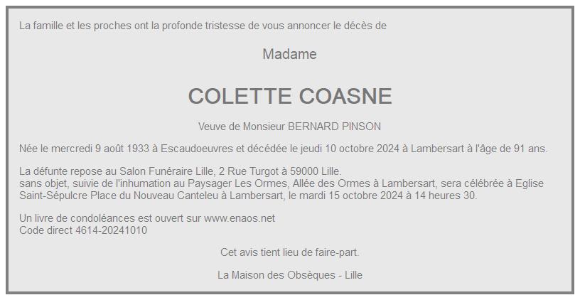 Cet espace « condoléances » est dédié à la mémoire de Madame COLETTE PINSON née COASNE.