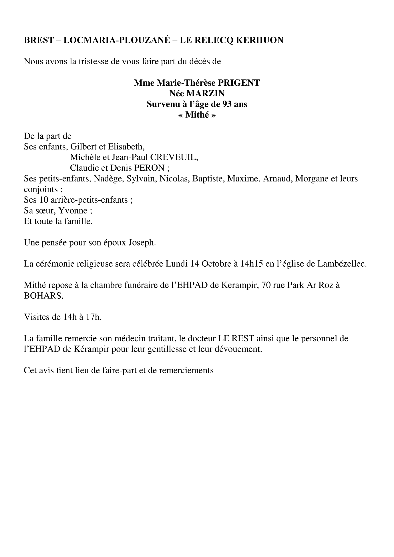 de Madame Marie-Thérèse PRIGENT née MARZIN