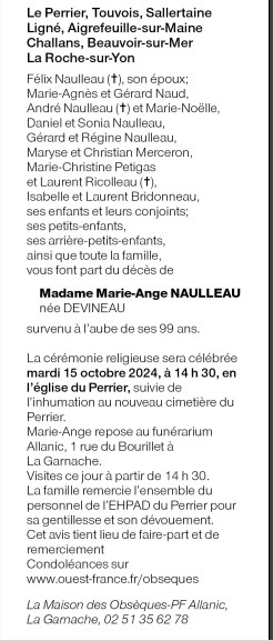 Cet espace « condoléances » est dédié à la mémoire de Madame Marie-Ange NAULLEAU née DEVINEAU.