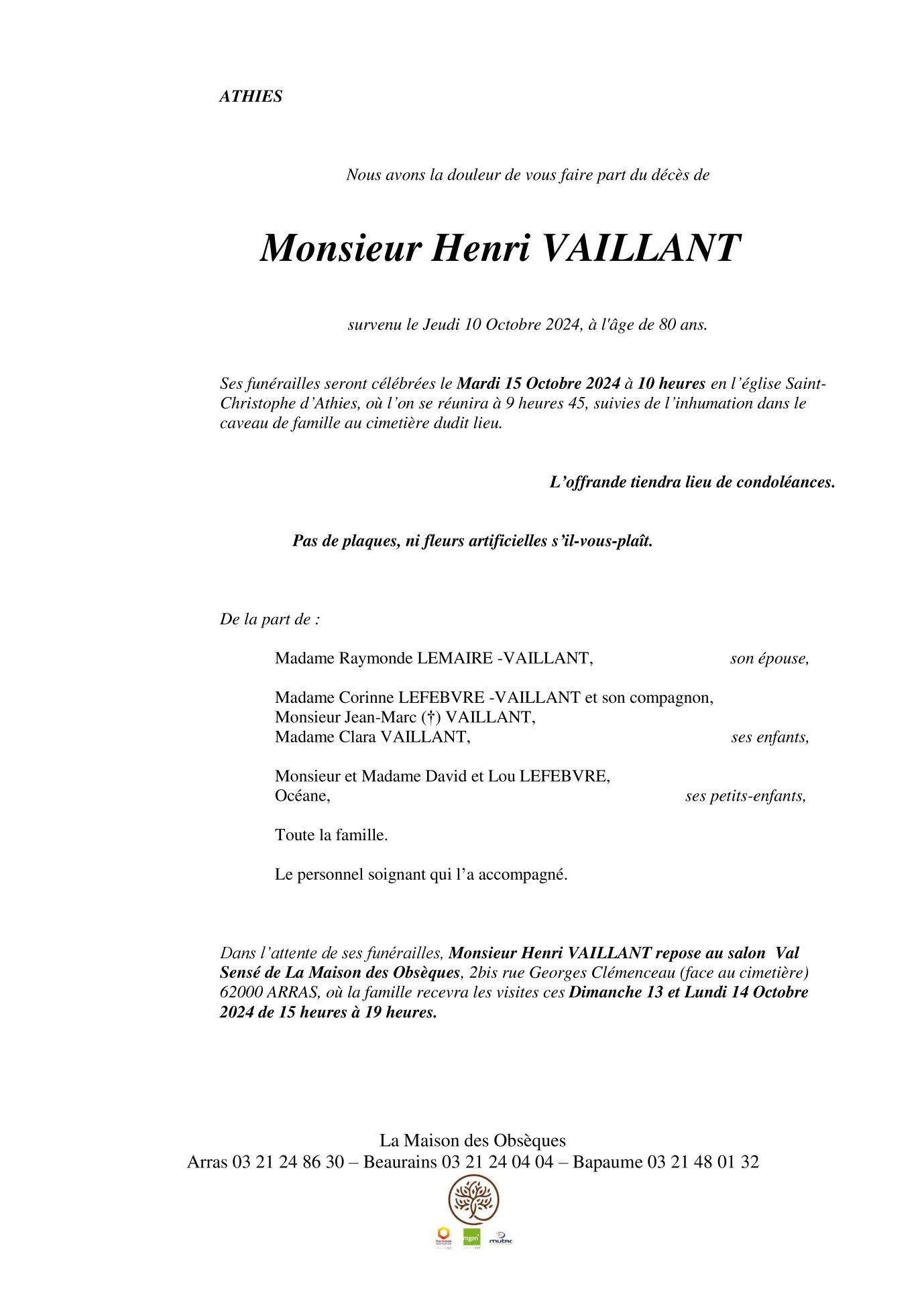 Cet espace « condoléances » est dédié à la mémoire de Monsieur Henri VAILLANT.