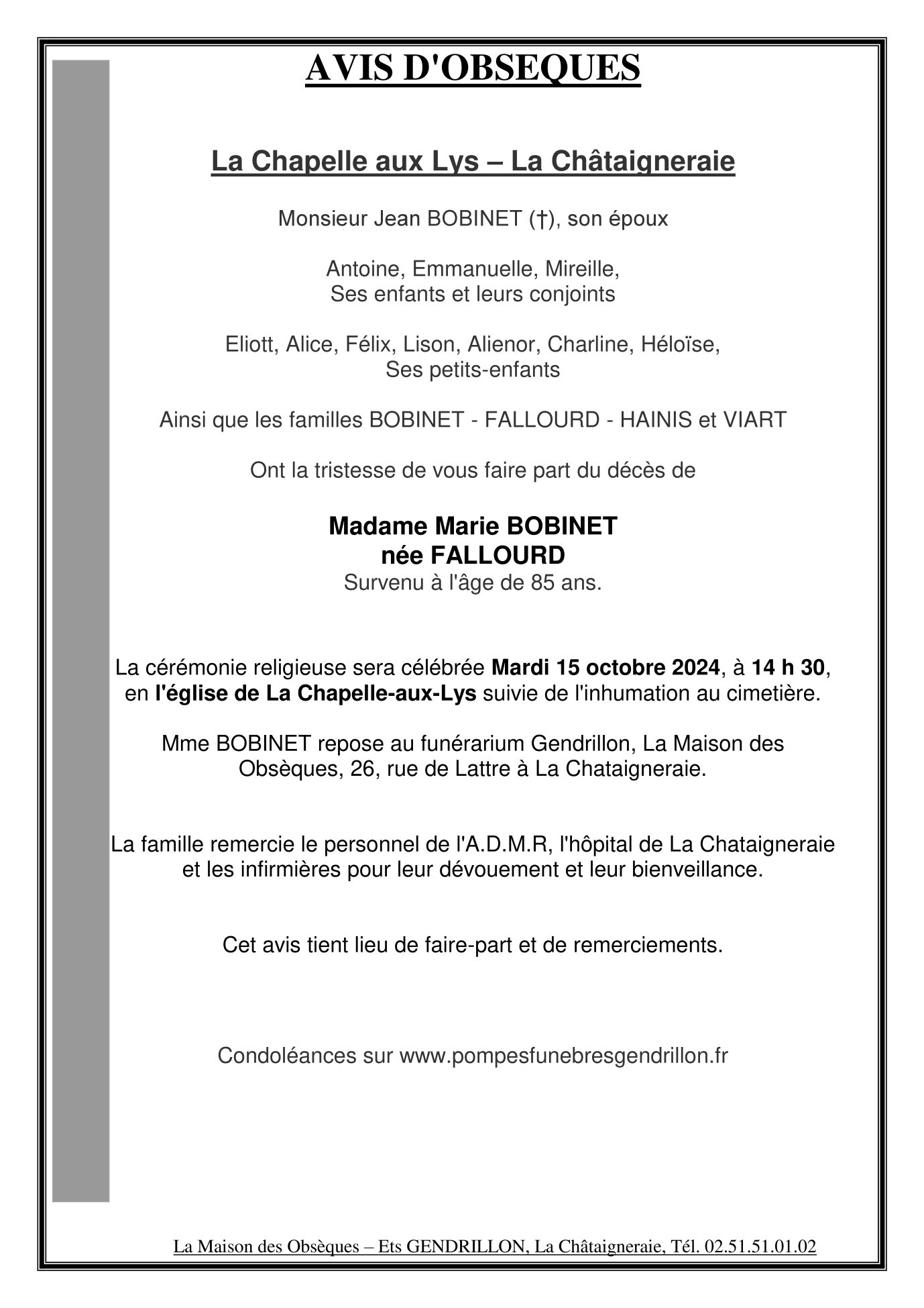 de Madame Marie BOBINET née FALLOURD