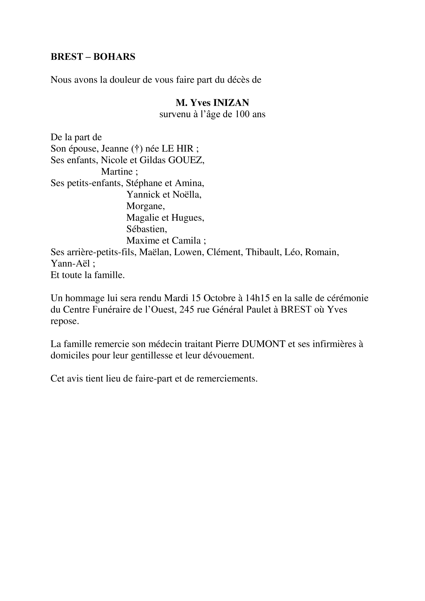de Monsieur Yves INIZAN
