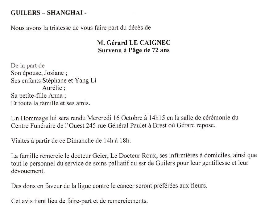 Cet espace « condoléances » est dédié à la mémoire de Monsieur Gérard LE CAIGNEC.