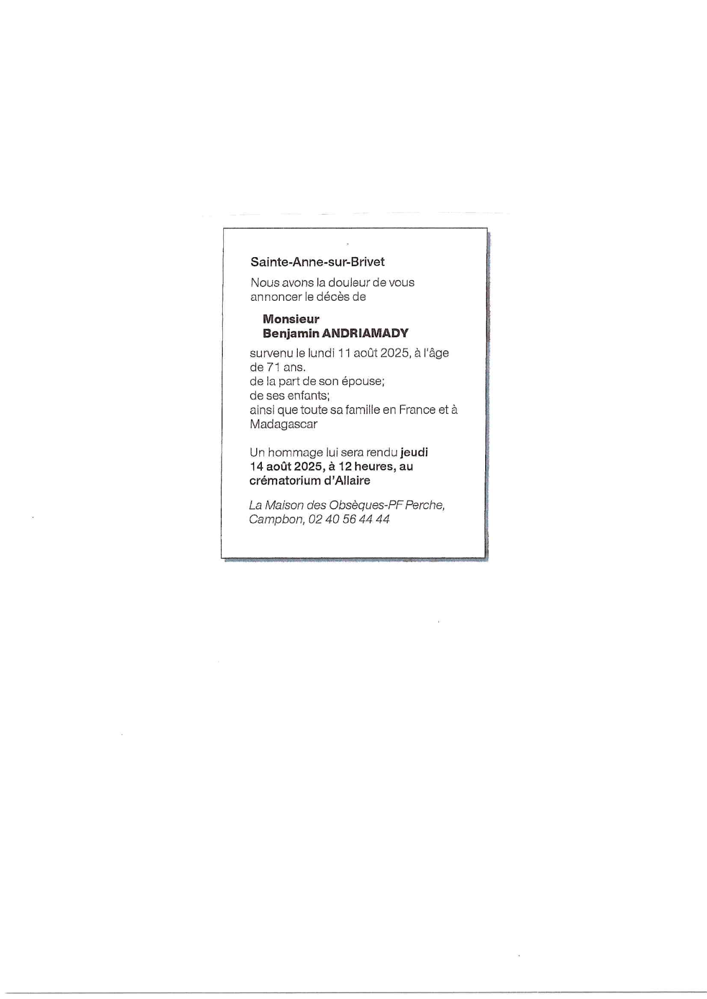 N’hésitez pas à renseigner cette page à vos connaissances. Ceux qui sont loin ou qui n’ont pas la possibilité de se joindre à la cérémonie trouveront ici une façon simple de montrer leurs sentiments à la famille dans ce moment difficile.