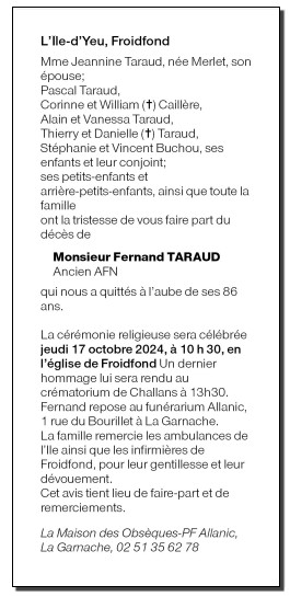 Cet espace « condoléances » est dédié à la mémoire de Monsieur Fernand TARAUD.