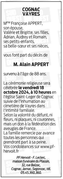 Cet espace « condoléances » est dédié à la mémoire de Monsieur Alain APPERT.