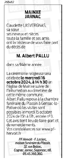 Décédé à Segonzac (16130) le samedi 12 octobre 2024