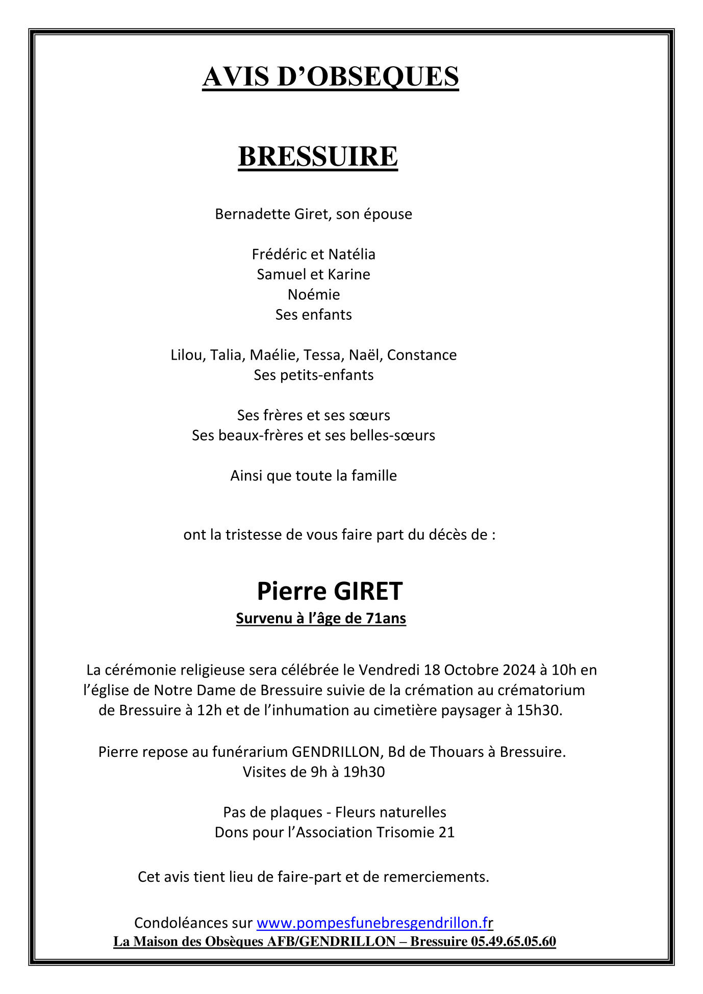 Cet espace « condoléances » est dédié à la mémoire de Monsieur PIERRE GIRET.