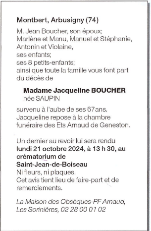Cet espace « condoléances » est dédié à la mémoire de Madame Jacqueline BOUCHER née SAUPIN.