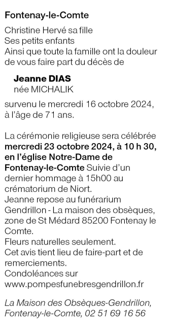 Cet espace « condoléances » est dédié à la mémoire de Madame Jeanne DIAS née MICHALIK.