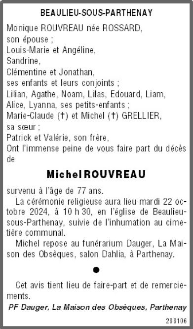 Cet espace « condoléances » est dédié à la mémoire de Monsieur Michel ROUVREAU.