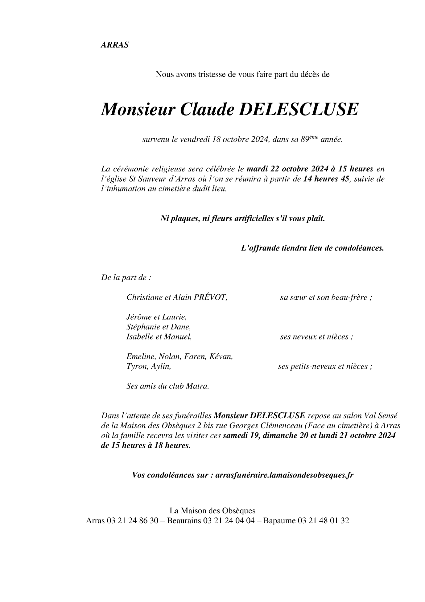 Cet espace « condoléances » est dédié à la mémoire de Monsieur Claude DELESCLUSE.