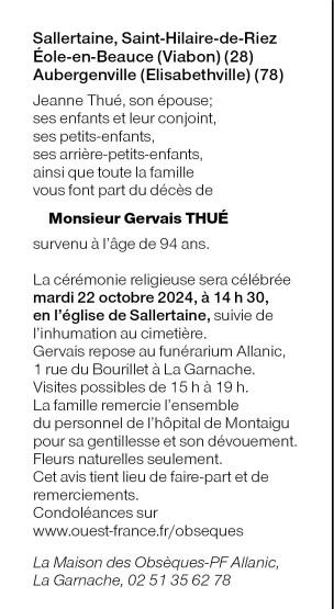 Cet espace « condoléances » est dédié à la mémoire de Monsieur Gervais THUÉ.