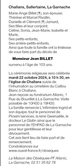 Cet espace « condoléances » est dédié à la mémoire de Monsieur Jean BILLET.