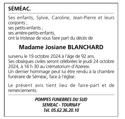 de Madame Josiane BLANCHARD née MARLOT
