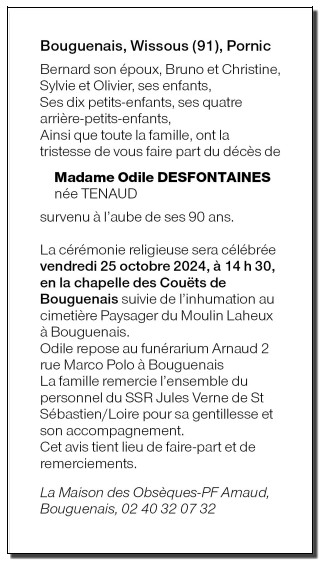 Cet espace « condoléances » est dédié à la mémoire de Madame Odile DESFONTAINES née TENAUD.
