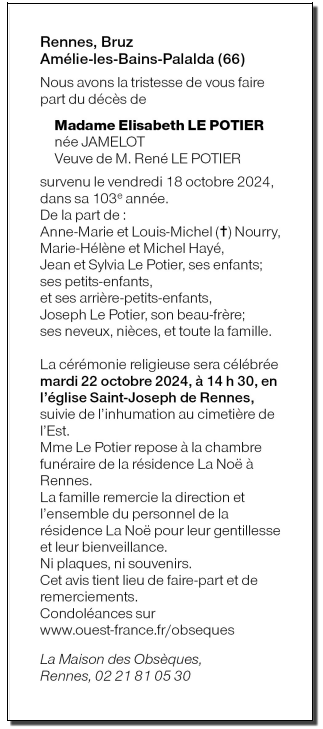 Cet espace « condoléances » est dédié à la mémoire de Madame Elisabeth LE POTIER née JAMELOT.