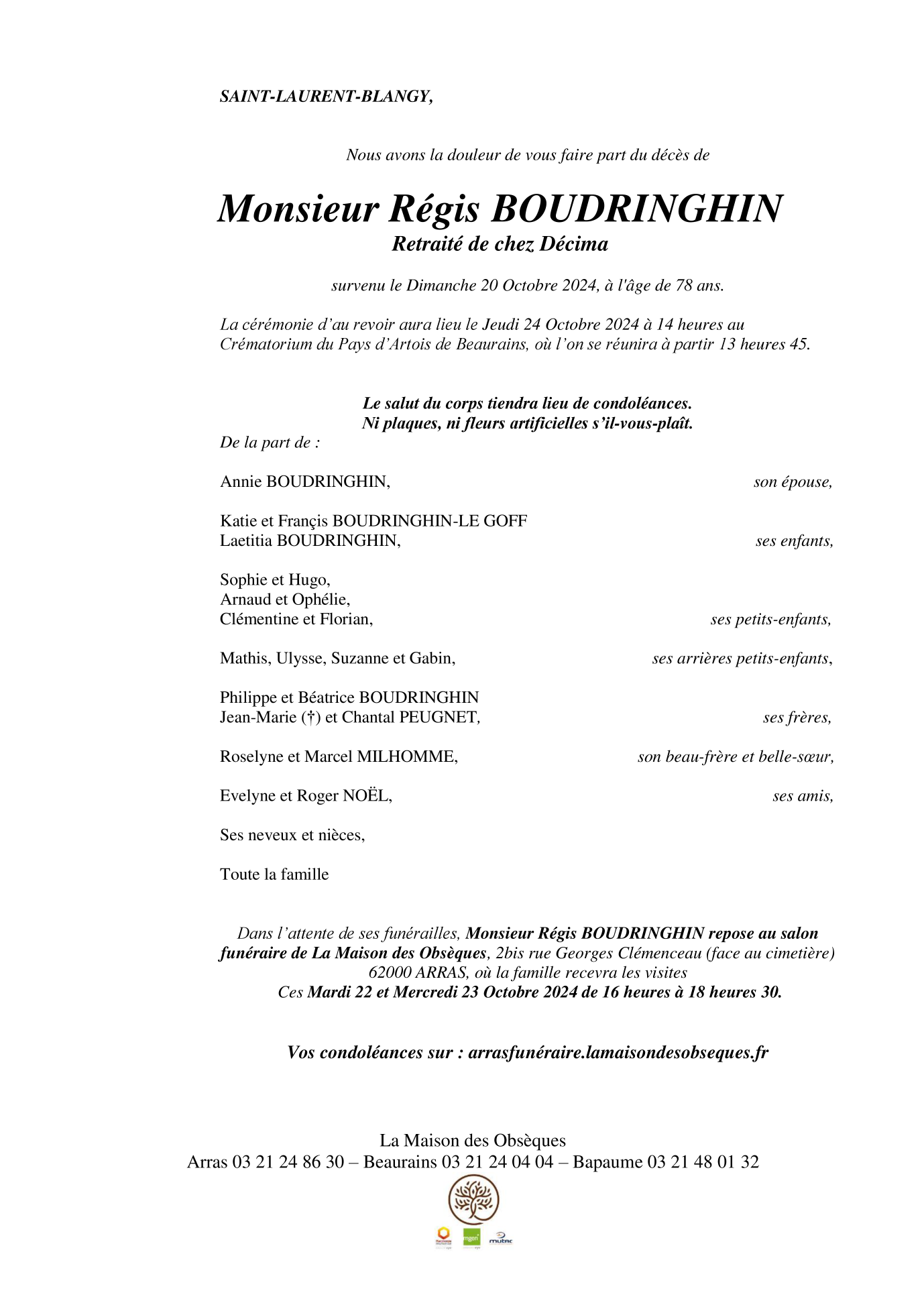 Cet espace « condoléances » est dédié à la mémoire de Monsieur Régis BOUDRINGHIN.