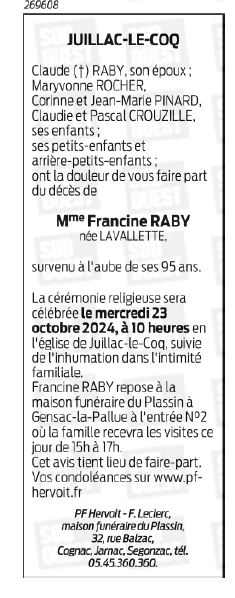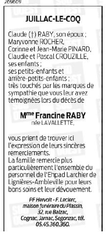 de Madame Francine RABY née LAVALLETTE