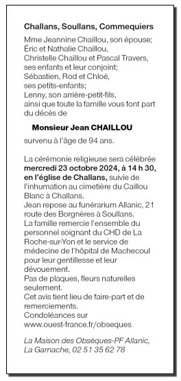 Cet espace « condoléances » est dédié à la mémoire de Monsieur Jean CHAILLOU.