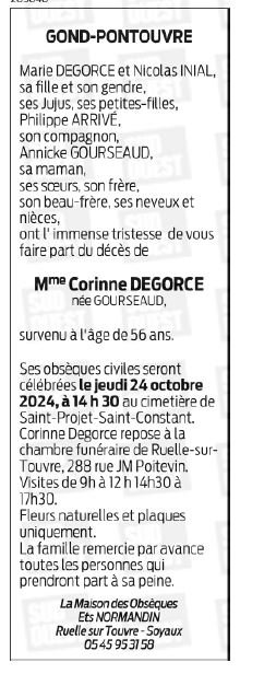 Cet espace « condoléances » est dédié à la mémoire de Madame Corinne DEGORCE née GOURSEAUD.