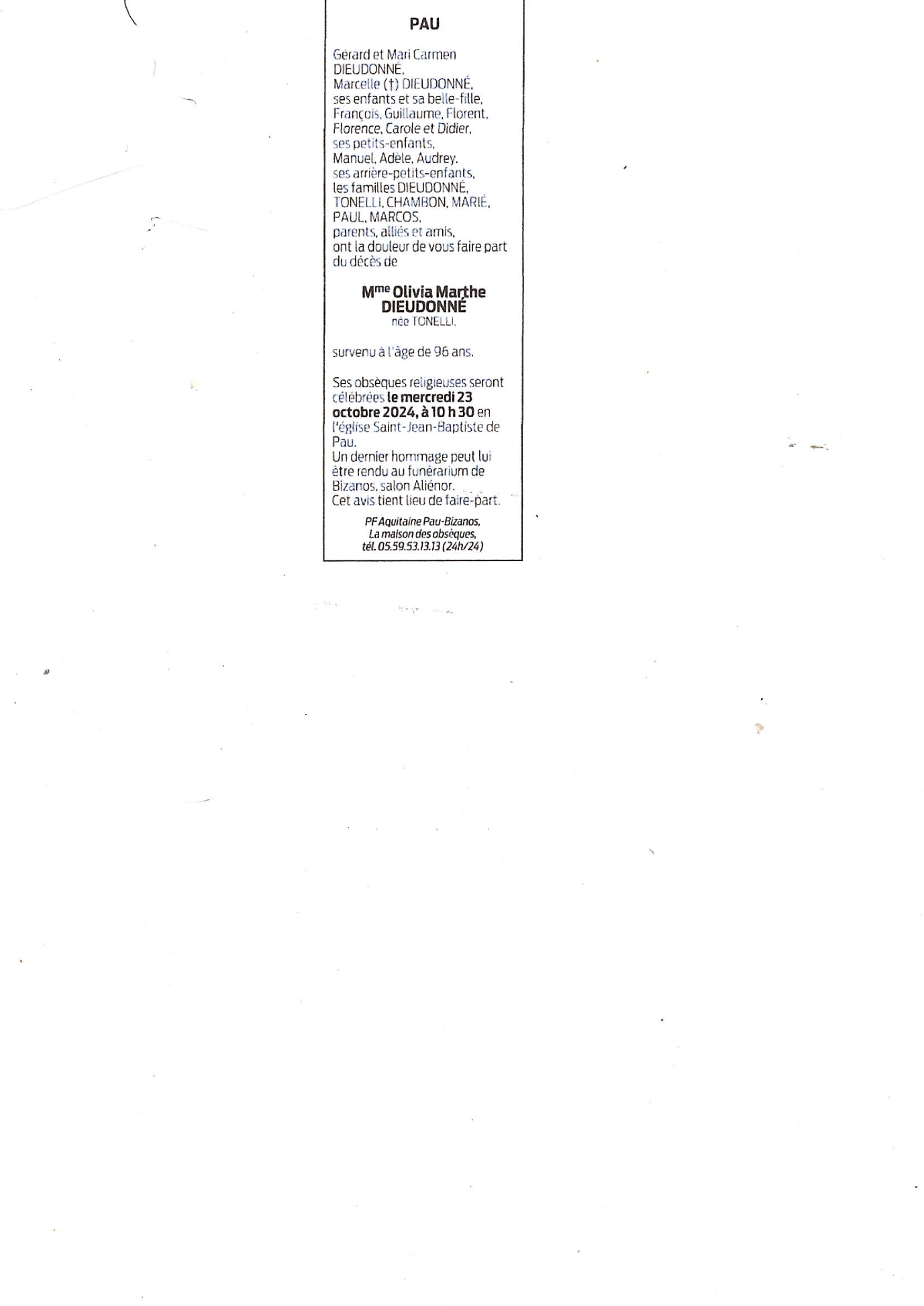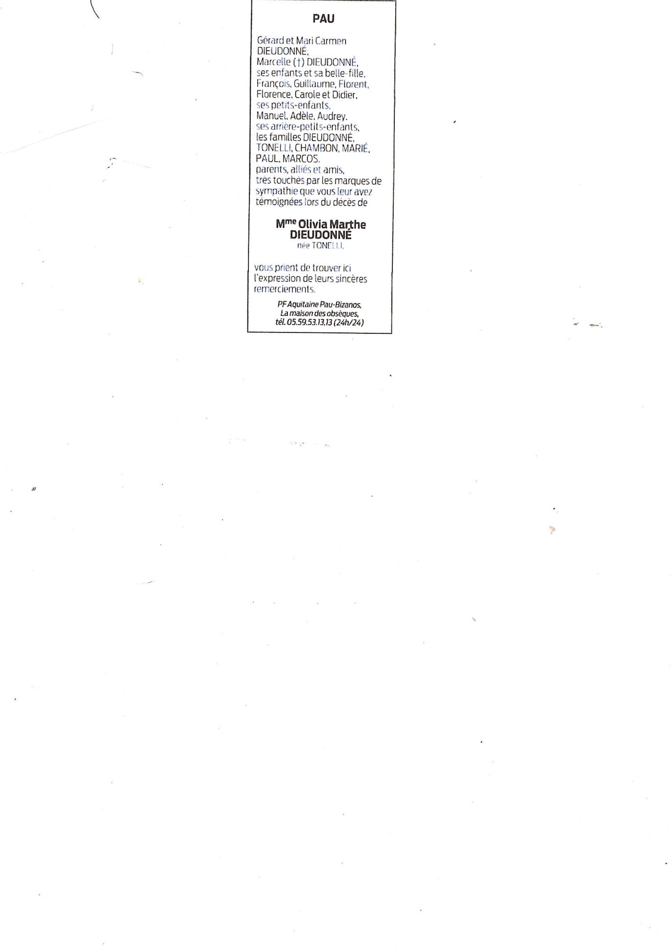 de Madame Olivia Marthe DIEUDONNÉ née TONELLI