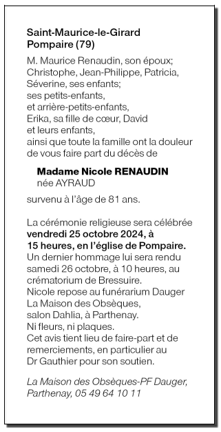 de Madame Nicole RENAUDIN née AYRAUD