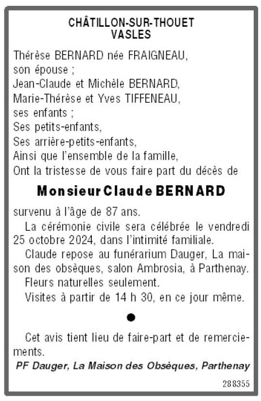 Cet espace « condoléances » est dédié à la mémoire de Monsieur Claude BERNARD.