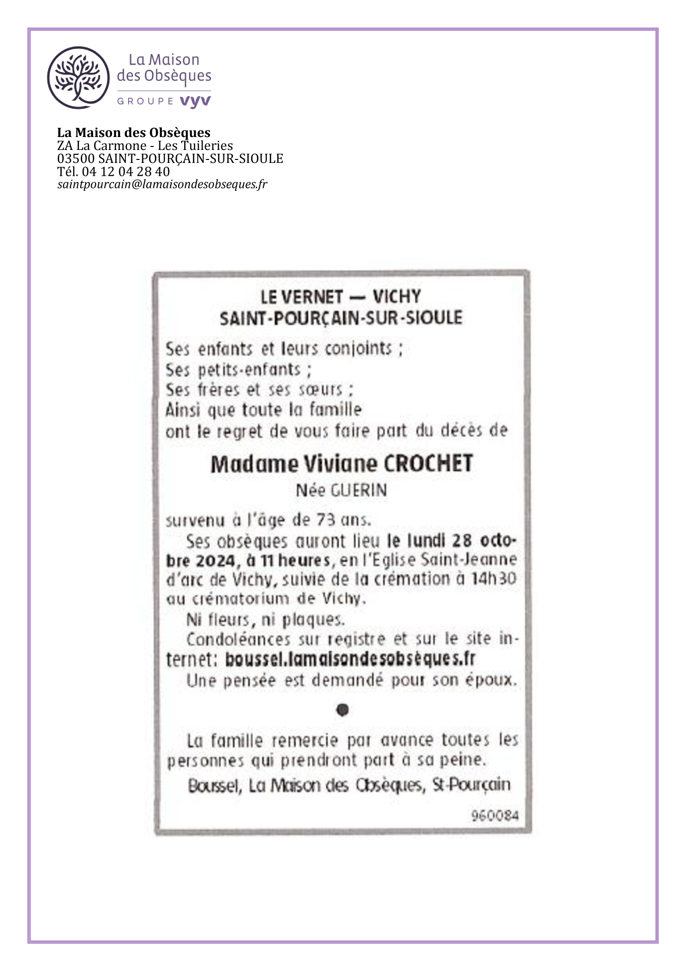 Cet espace « condoléances » est dédié à la mémoire de Madame Viviane CROCHET née GUERIN.