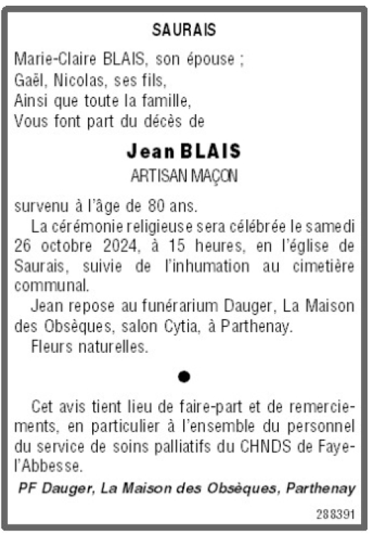 Cet espace « condoléances » est dédié à la mémoire de Monsieur Jean BLAIS.