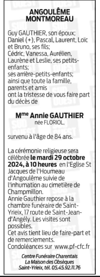 Cet espace « condoléances » est dédié à la mémoire de Madame Annie GAUTHIER née FLORIOL.