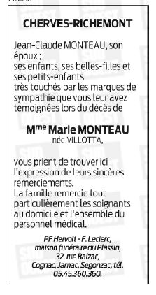 Cet espace « condoléances » est dédié à la mémoire de Madame Marie Anne MONTEAU née VILLOTTA.