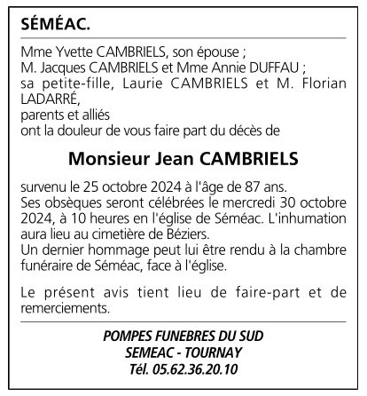 Cet espace « condoléances » est dédié à la mémoire de Monsieur Jean CAMBRIELS.