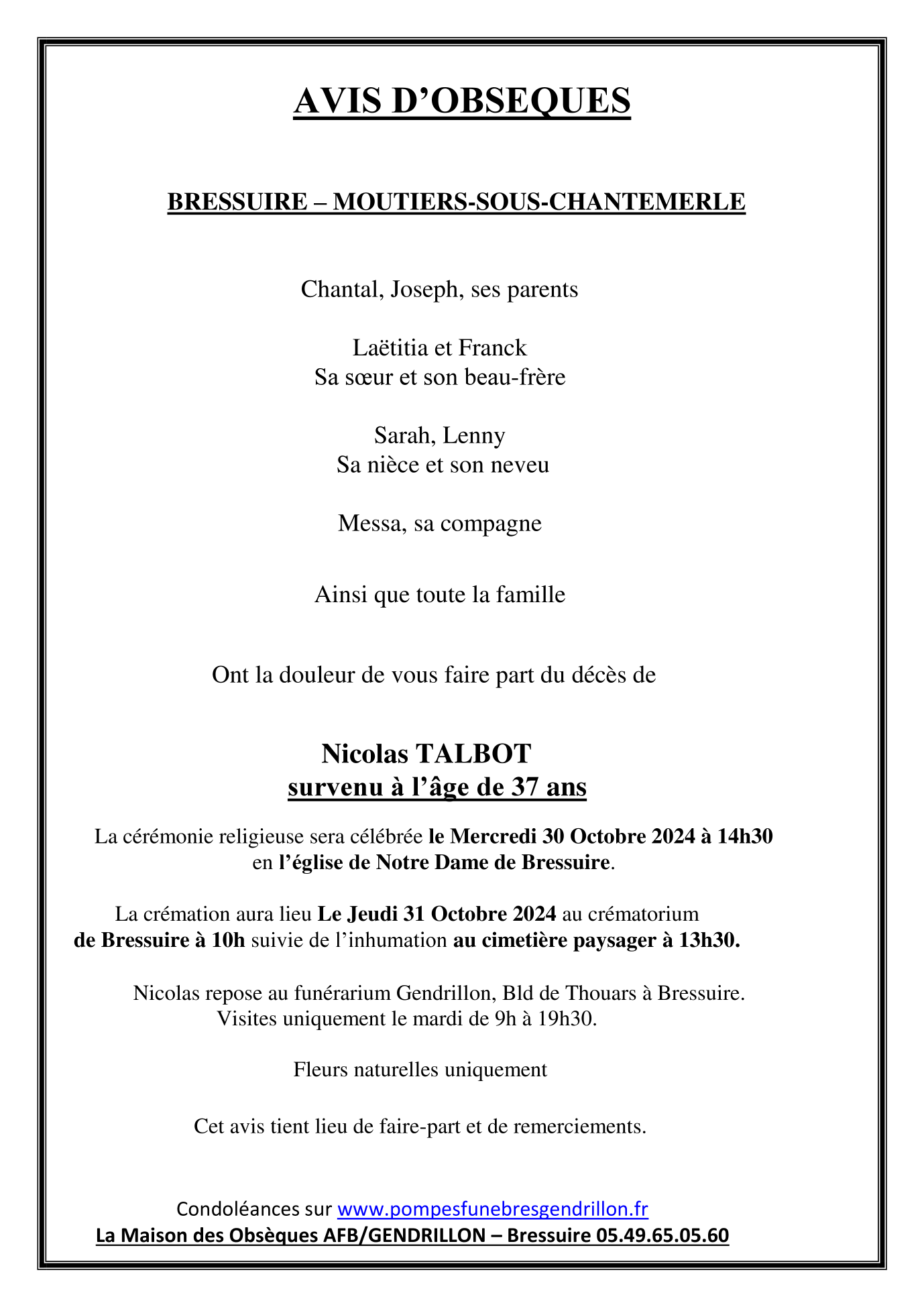 Cet espace « condoléances » est dédié à la mémoire de Monsieur Nicolas TALBOT.