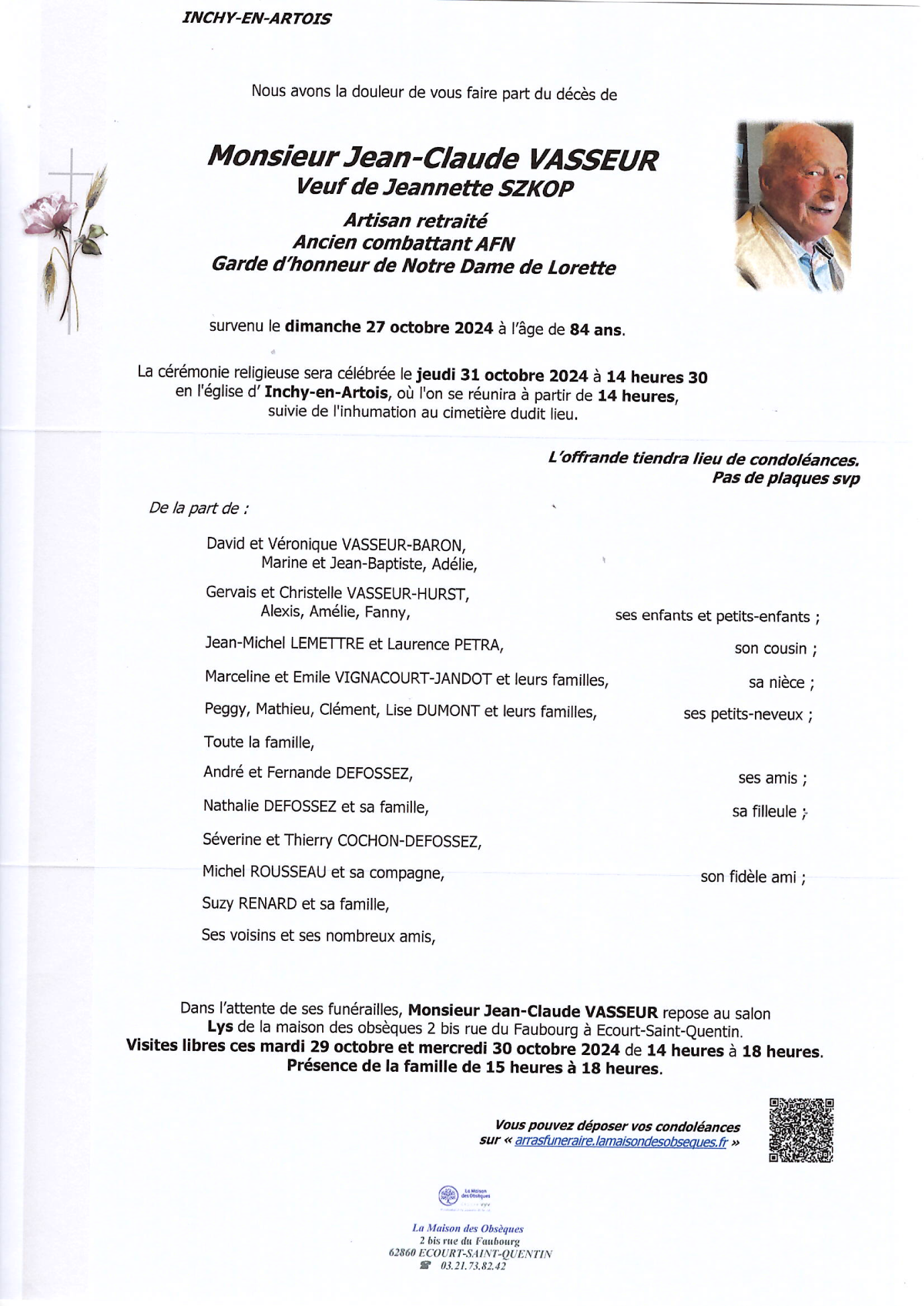 Cet espace « condoléances » est dédié à la mémoire de Monsieur Jean-Claude VASSSEUR.