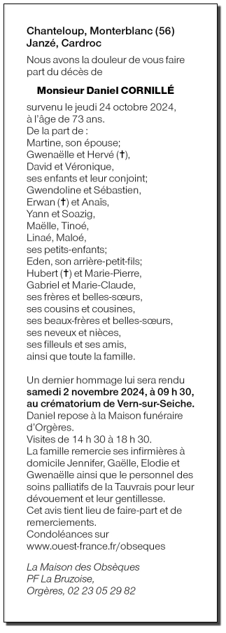 Cet espace « condoléances » est dédié à la mémoire de Monsieur Daniel CORNILLÉ.