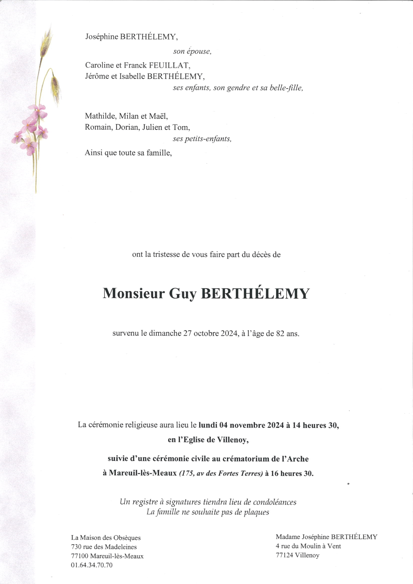N’hésitez pas à renseigner cette page à vos connaissances. Ceux qui sont loin ou qui n’ont pas la possibilité de se joindre à la cérémonie trouveront ici une façon simple de montrer leurs sentiments à la famille dans ce moment difficile.