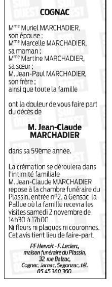Cet espace « condoléances » est dédié à la mémoire de Monsieur Jean-Claude MARCHADIER.