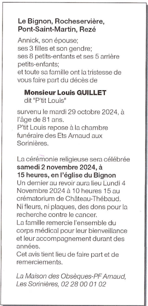 Cet espace « condoléances » est dédié à la mémoire de Monsieur Louis GUILLET.