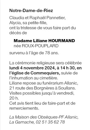 Cet espace « condoléances » est dédié à la mémoire de Madame Liliane HOURMAND née ROUX-POUPLARD.