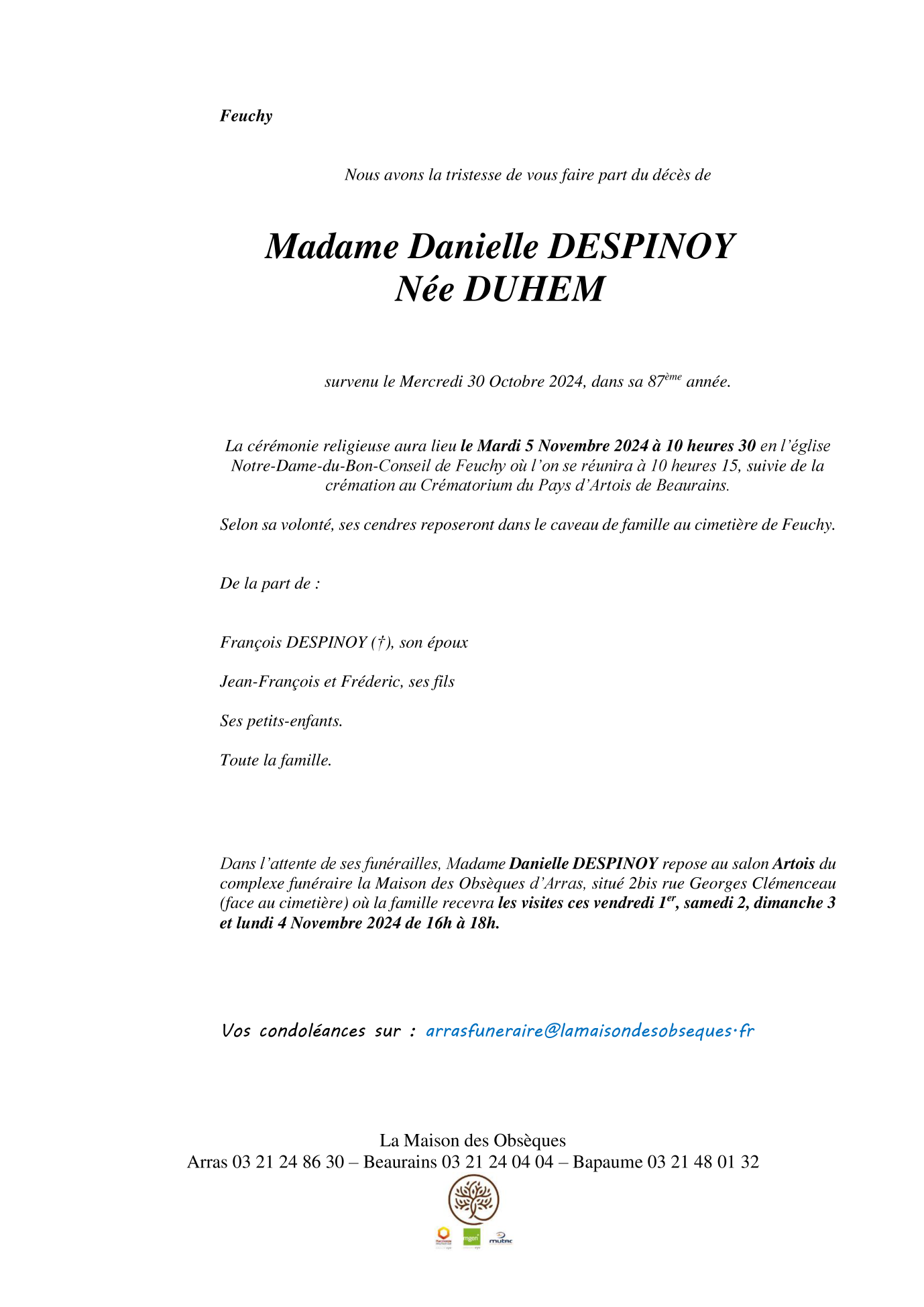 Cet espace « condoléances » est dédié à la mémoire de Madame Danielle DESPINOY née DUHEM.